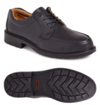 Black smooth leather safety shoe. Padded collar for added comfort. Steel toe cap and composite midsole protection. Moisture wicking inner lining. Dual density polyurethane outsole. Anti-static. A lightweight executive style uniform shoe for lighter duties.